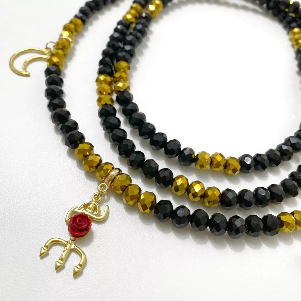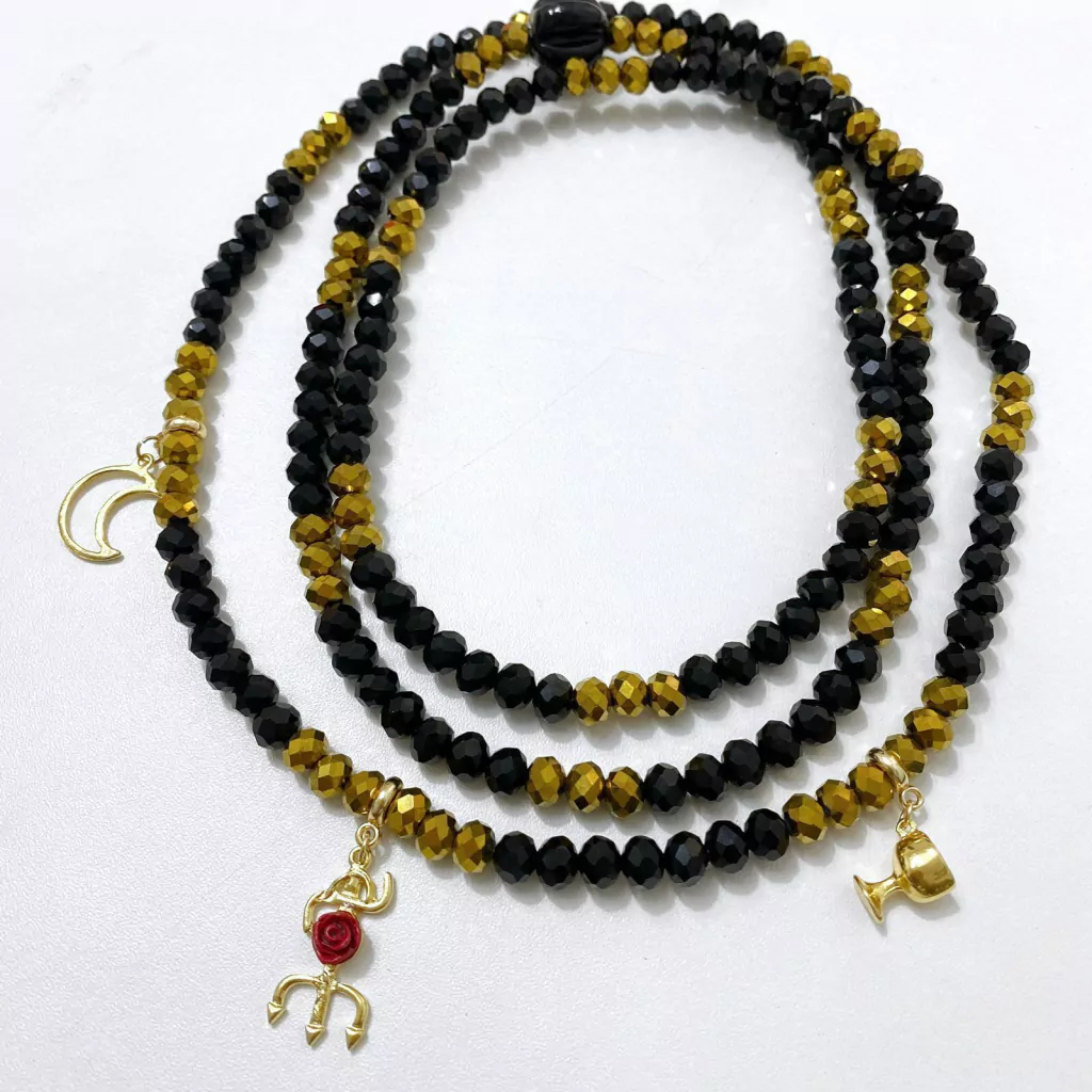 Guia de cristal 8mm para Pomba Gira com pingentes dourados